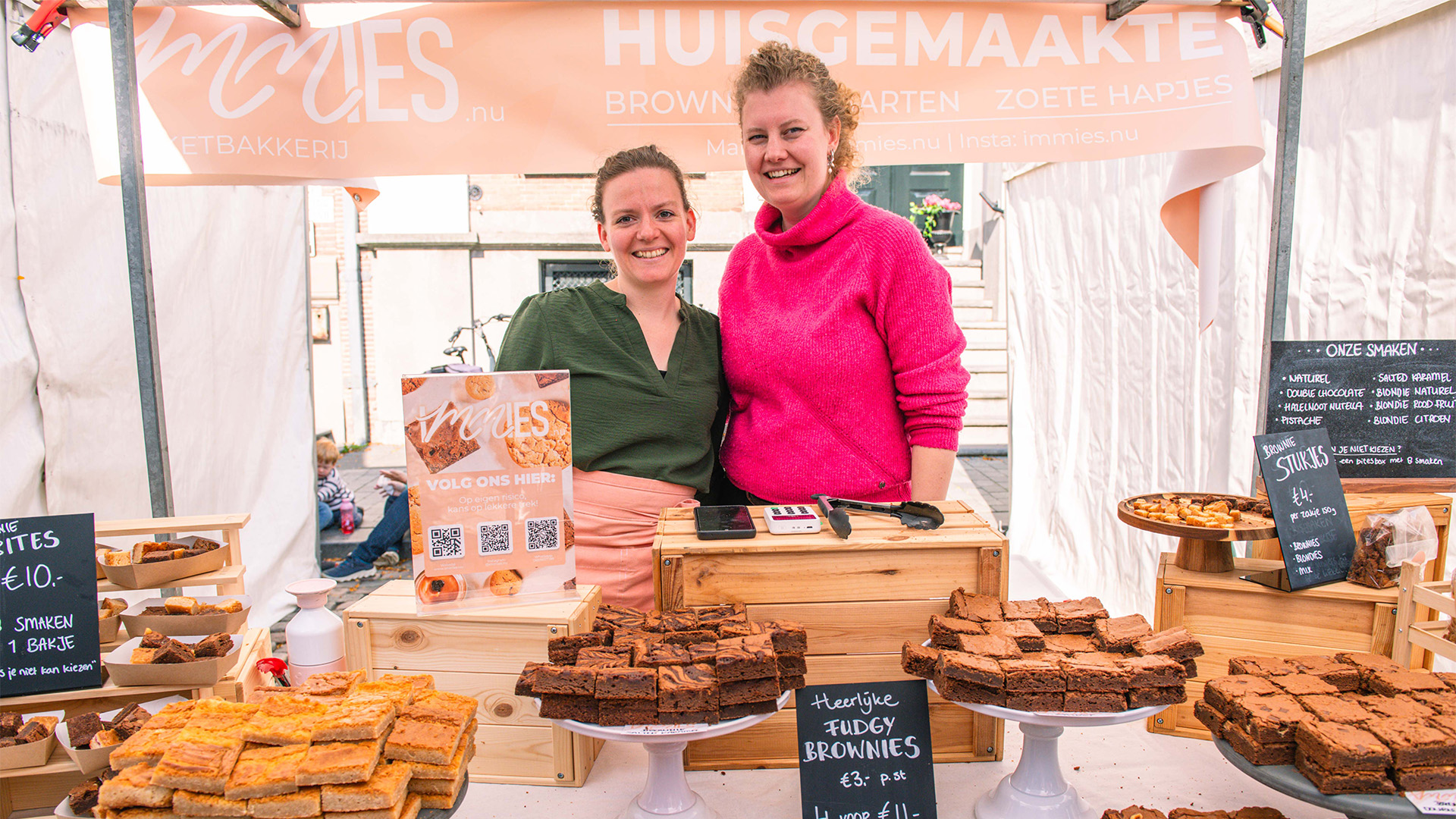‘Laat je verblijden door een kraam vol met zoete baksels. Heerlijke smeuïge brownies die rijkelijk gevuld zijn of koekjes zoals ze het lekkerst zijn: knapperig van buiten en zacht in het midden. Om gelijk al op te eten of lekker om mee te nemen naar huis. Met natuurlijk heerlijke chocoladesmaken. Wat dacht je van de triple chocolate brownie of een Giant cookie met witte chocolade en rood fruit.